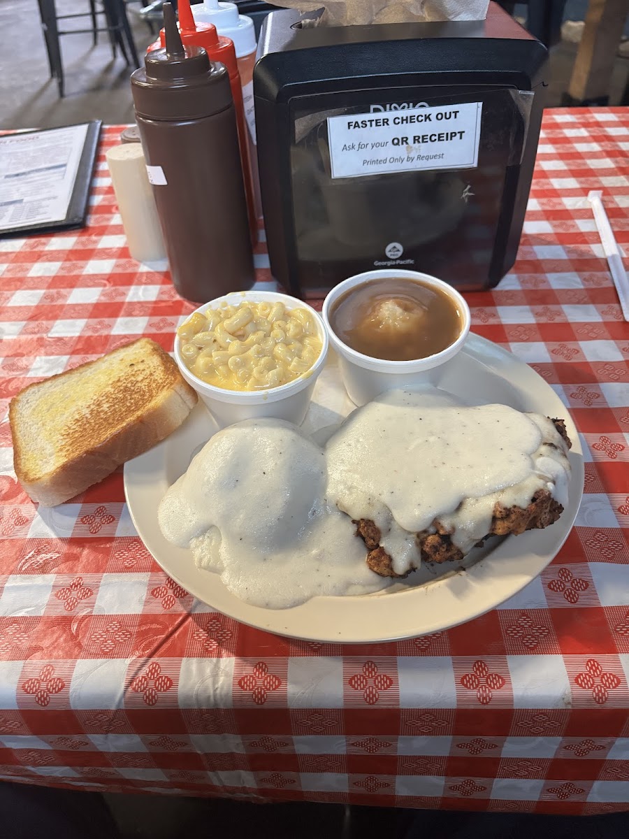 Impressive, being my 1st time I walked in with Brisket on my mind. My waitress immediately came and asked for my drink order. Mind you this is an extremely popular place. And was very crowded. But adequate seating. She brought my beverage quickly and then recommended the special. Chicken Fried Steak, 2 scoops of mashed potatoes. One with cream the brown gravy. And Mac n cheese. The chicken fry was literally outstanding. Not a thin cut of meat. But very tender with no visible mechanical tenderizing applied. I will eat here again. Just had lunch here for the 2nd time. As before it was very crowded again. Which states a lot about this place. But my addition this time is the staff. Friendly, Courteous, Professional, to sum it up they’re a bad ass team. My waitress Rachel was phenomenal. If I could hire this team in the field I could eliminate a sizable portion of my payroll. But not going to because this is a great kept secret. Don’t want anyone else now to know.